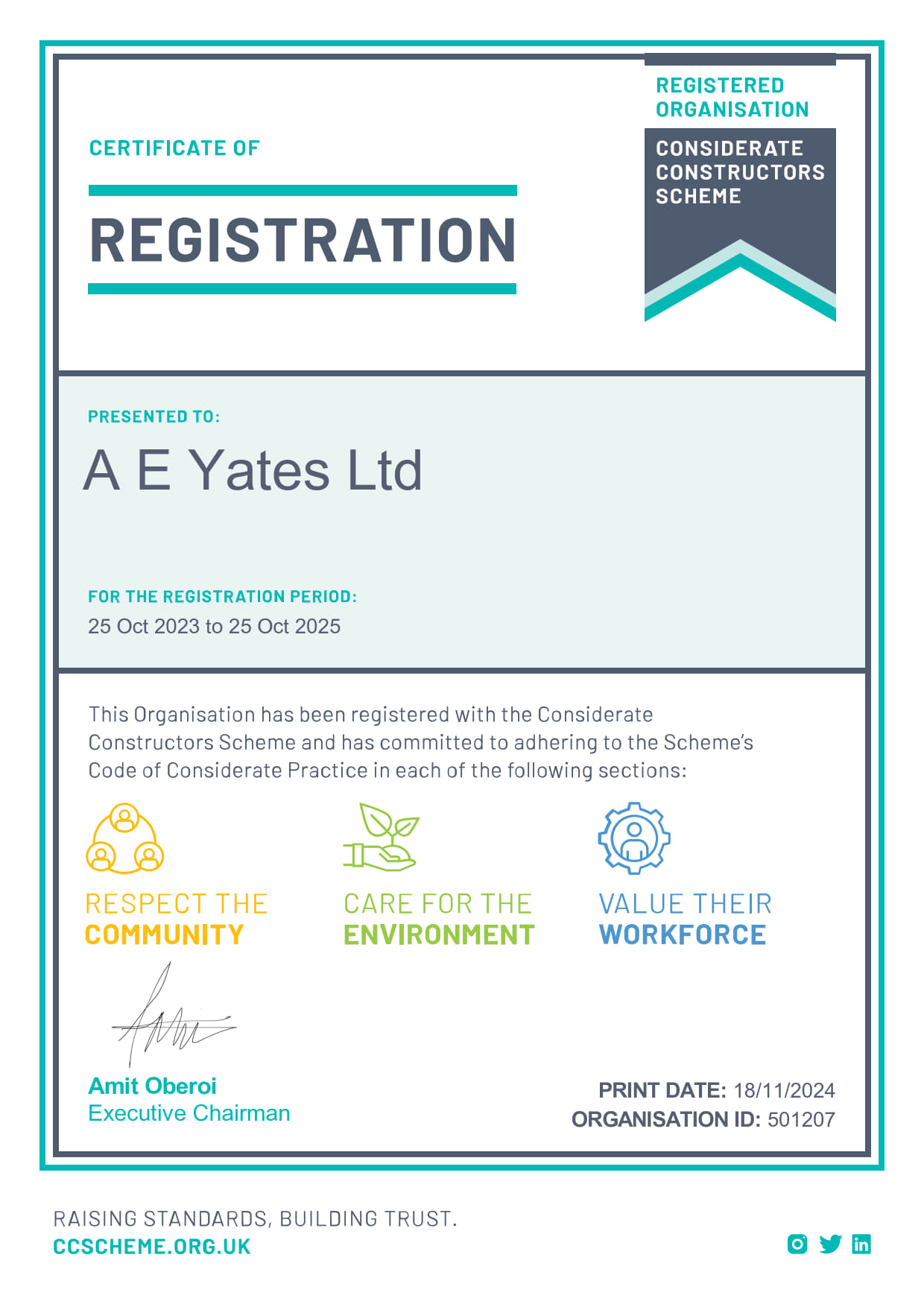 CHAS Certificate – Accreditation within the Contractors Health and Safety Assessment Scheme having demonstrated compliance with, and sound management of, current basic health and safety legislation.