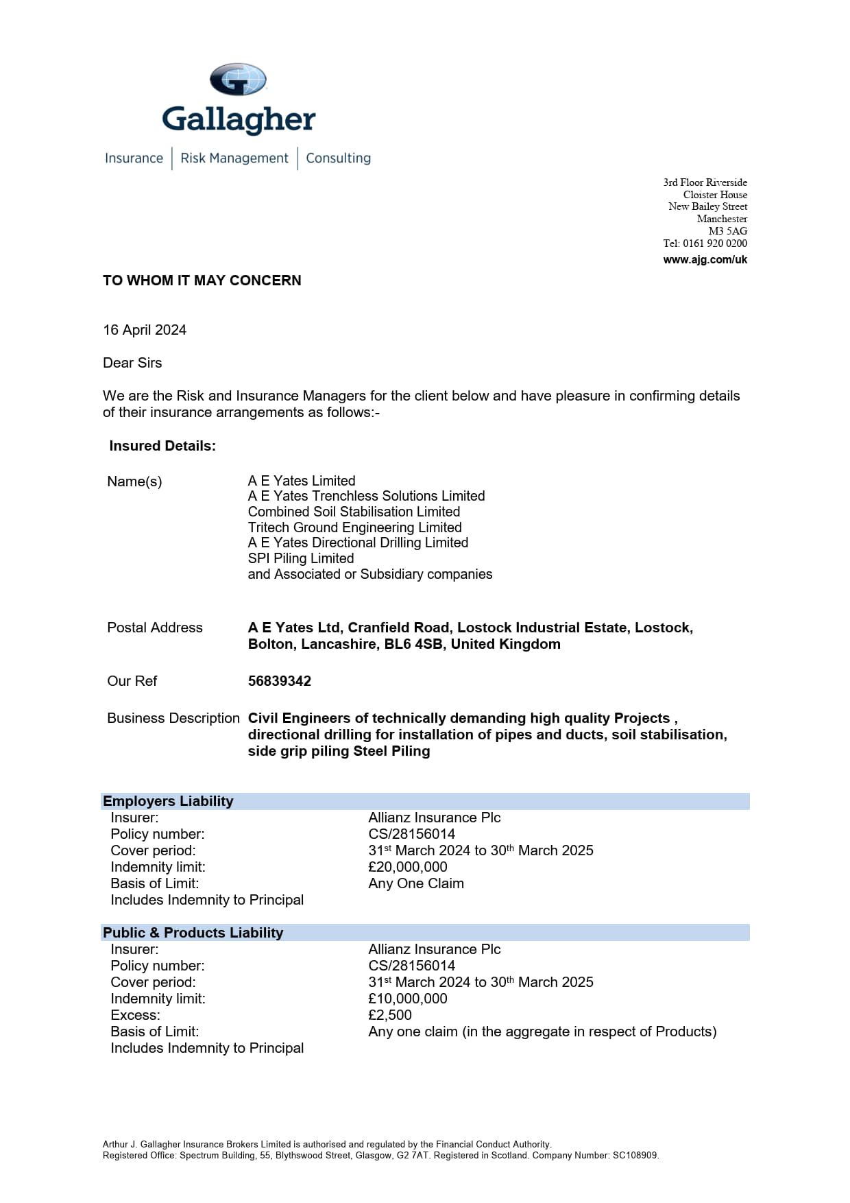 Insurances – Details including Employer’s Liability, Public/Products’ Liability and Contractors All Risks.