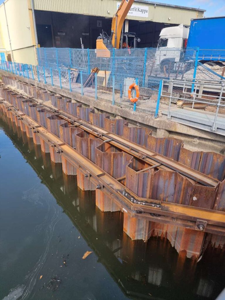 This project for ASKAM Civil Engineering consisted of the pre-auger and installation for a permanent retaining wall consisting 44nr new GU16N steel sheet piles varying in length from 6.5m to 8.0m.The AugerTorque 65000 MAX excavator mounted auger was used for augering and the Grizzly MG90 side-grip vibratory hammer was used to complete this project. Due to the proximity of an existing sulphuric acid tank, vibrations were a concern to the plant owners. As such a vibration monitor was installed which monitor the vibrations 24hr a day and a weekly report of the vibrations produced, vibrations recorded on this project were less than 25mm/s.