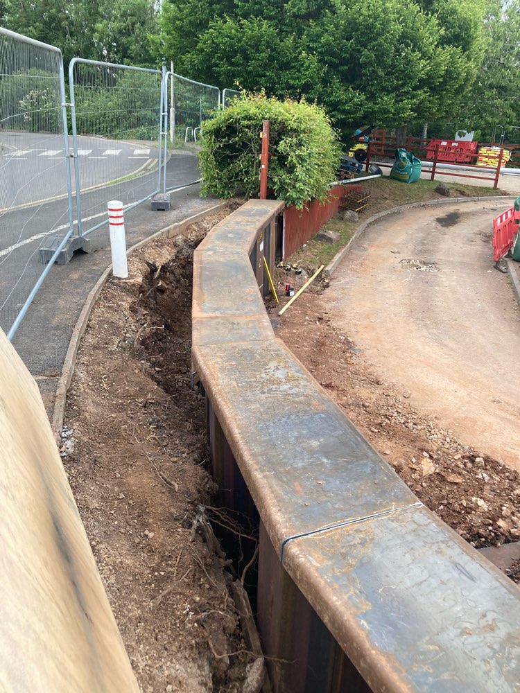 Upon completion of the pile installation, a 540mmx100mm steel capping beam will be welded to the pile tops. The client will then dig down to the open side of the piled wall and construct a new concrete base and plinth for a new chemical tank.